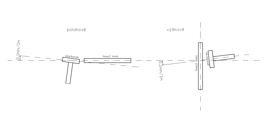 V ustavení pastorků vůči ozubeným kolům byly polohové odchylky až 4,5mm/1m a 3,2mm/1m ve výšce (viz obr. 3). Ustavením byly kontrolním měřením zjištěny odchylky v geometrii pastorku 0,1mm/1m v poloze i výšce (viz obr. 4). Zároveň ovšem bylo nutné dodržet nastavení zubových vůlí, které zadavatel určil na hodnotu 3 – 4mm. Tímto byl správně ustaven pastorek a předloha. Vůči nim byly následně pomocí laserové soupravy Easy-Laser E950 ustaveny také převodovka a motor, dle tolerancí pro nesouosost hřídelí.